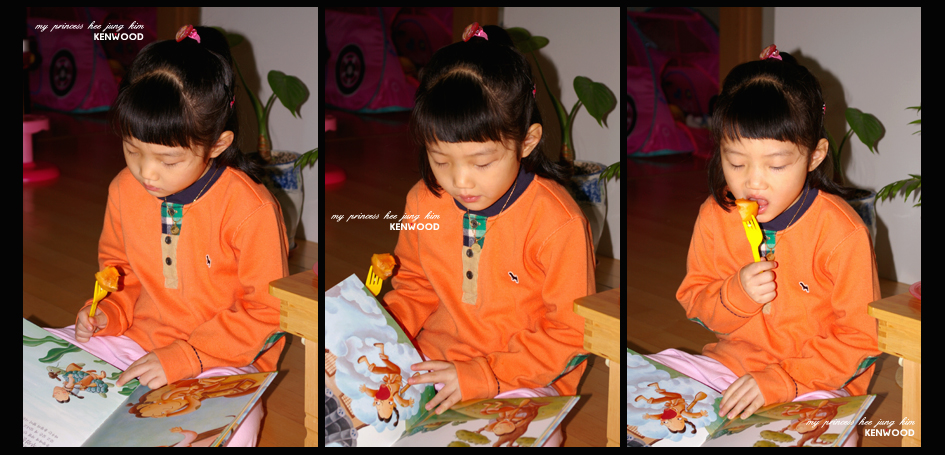 독서삼매경에 빠져서.. 아빠가 사진찍는대 쳐다보지도 않네여.. 감먹으면서 책보는희정이..다컸네.. 이제부터 슬슬 아빠를 멀리.........=3=3=3=3=3